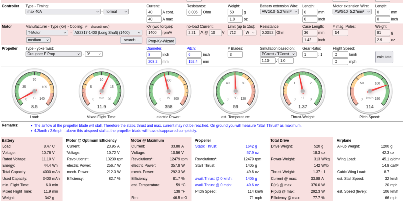 I use eCalc - propCalc to calculate some thrust values for three types of prop I already have in my box. All are using a 3S battery and a 40A ESC as I have these sat in my box also.